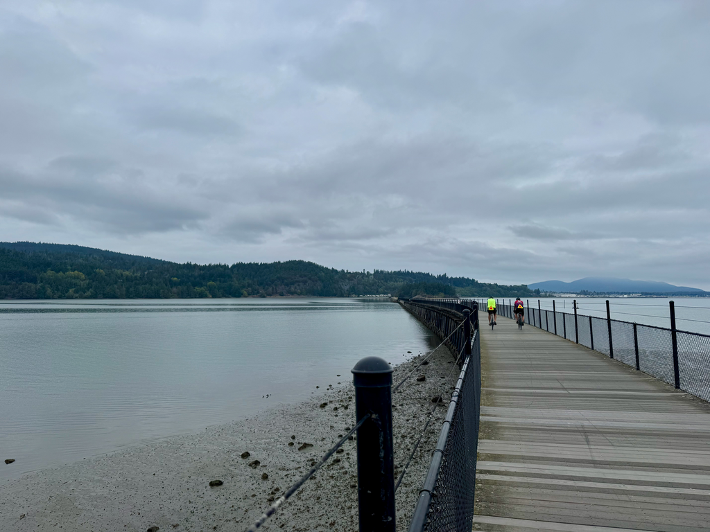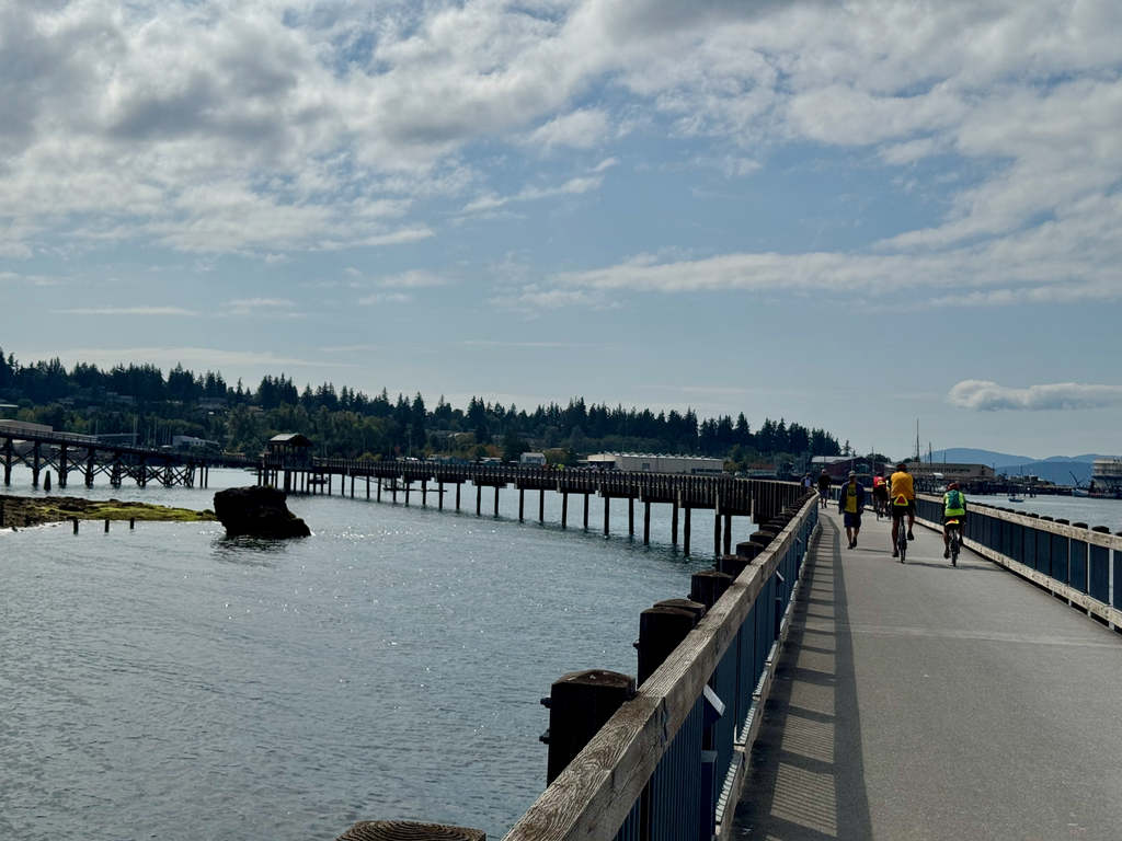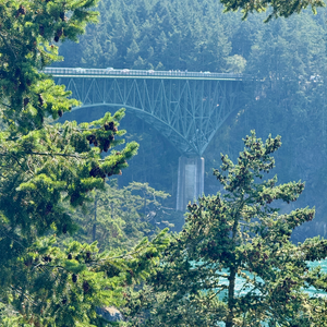 The day included a few more miles of great bike trails, some great downhills, and the Deception Bridge in two of the following pictures. Beautiful bridge w/ heavy car traffic and a tiny raised walkway on the side. A couple of us opted to take up the whole lane, which took the tension out of it for me. I worry more about walking/biking along 300-ft drops than a car or 10 :-) I was vindicated when one of the Jeffs was finishing the walk across the bridge on the narrow pathway, saw me waiting, bumped a protrusion from the railing and teetereed awkwardly against the railing. Jeff is 6'4"; the railing looked very low. But all was good!