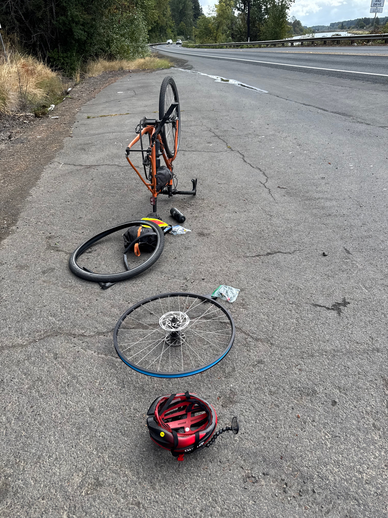 (1) it wasn't a simple pinch or puncture flat, so I couldn't patch it and be on my way, and (2) during the rain the previous night I'd taken my frame bag into the tent, and during reorganization my extra tube fell out....