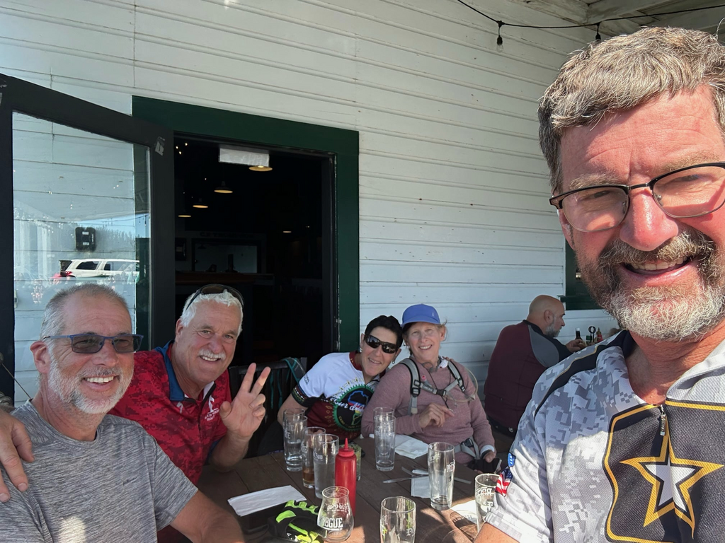 I had a blast w/ those three until we hit the 17% hill (!!!), after which I biked mostly with Pam (not fast but incredibly strong, recently rode the Tour D'Afrique from Cairo to Cape Town (6000 miles, 4 months, in Africa), Tim, a laconic dude from Louisiana, and Jeff G, a recently retired high mucky-muck from ATT and who lives in Ohio and Florida. We also spent some time with Anne, who works in senior living and serves on boards for community banks.
