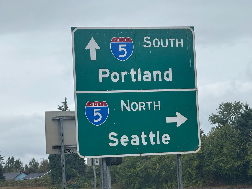 I wasn't worried about the cars, we had a broad shoulder and signage informing drivers about cars. I was more worried about flats: I've ridden three other interstates and gotten flats on two, so I was very careful to not ride close enough to Anne that I couldn't see the kind of truck tire detritus that causes them. I-5 was fun! I got a Starbucks double shot espresso at a rest area and was feeling very strong so I climbed the hills w/ Anne and caught Doug and Molly (who did this tour) on an uphill.