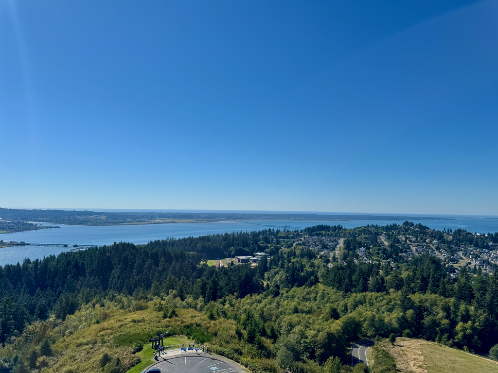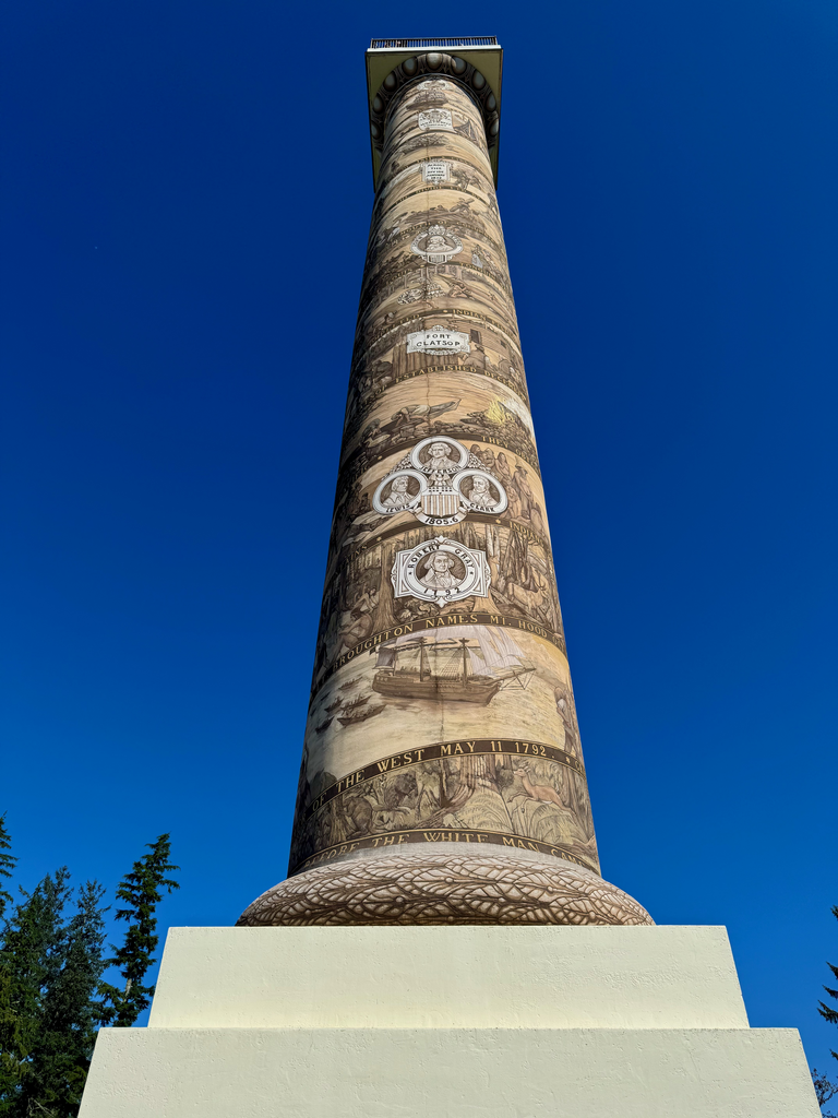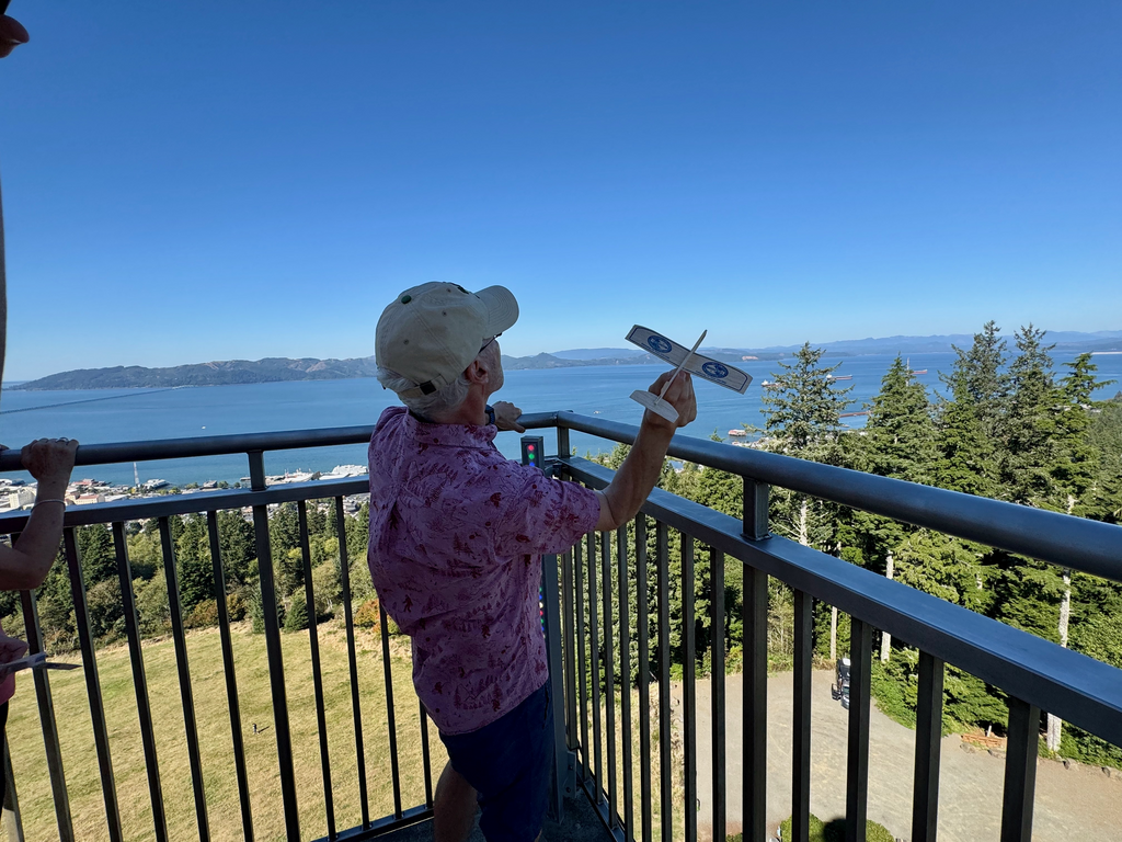 After a breakfast in the parking lot (there was a gazebo), we separated. I walked to the laundromat, and then a bike shop to get some new tubes. Afterwards I caught up on a few work things, did this blob, and then Jim, his wife (Carol?), Anne, Pam, Bob and I piled into Carol's van and went to the Astoria Column, which has 164 steps up and sits on a 600-ft hill. Beautiful views, and the local gimmick is throwing balsa gliders off the top. Most of ours didn't go that far, but Bob's probably went half to three-quarters of a mile and ended up in the sound.