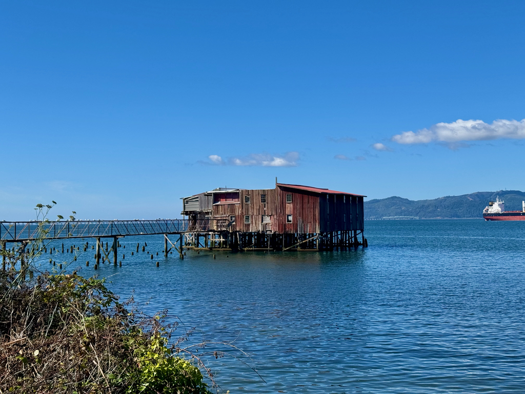 The highlight of this day, besides the ferry ride (love ferries), was the stop at Rogue Brewery. Rogue makes great beer but is mostly unknown in most of the country. I had no idea it was here and just turned at the sign. This took me out on an old wooden pier where they had their "Public House", w/ all their beers on top. Six more folk showed up before we finally left.