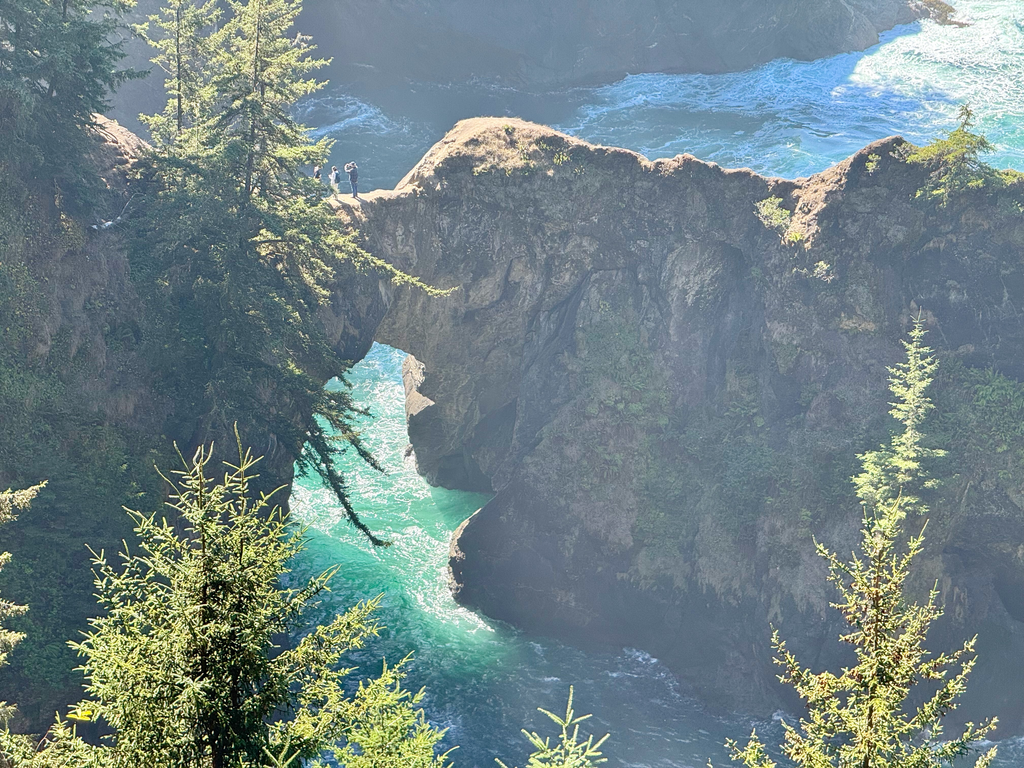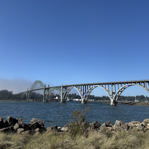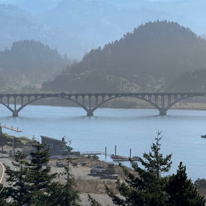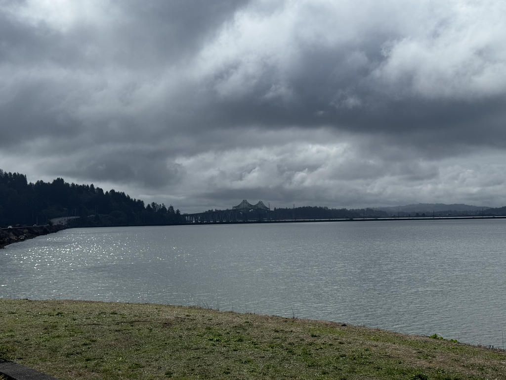For me one of the highlights was the Yaquina Bay Bridge just before getting to the South Beach State Park campground. This is not a bridge that would cause me problems if on the driving surface. The only option was to walk the half-mile bridge on the narrow sidewalk. So four of us decided to take up a lane. I hit the bicycles-on-bridge button that turned on the flashing yellow lights, Jeff saw a mini-break in the traffic with a truck pulling a boat behind it and immediately pulled out into the lane. The rest of us followed and we cruised peaceably across. We did have one guy wish us a cheerful "Good day!" as we pulled off the road, or at least that's how I choose to interpret it.