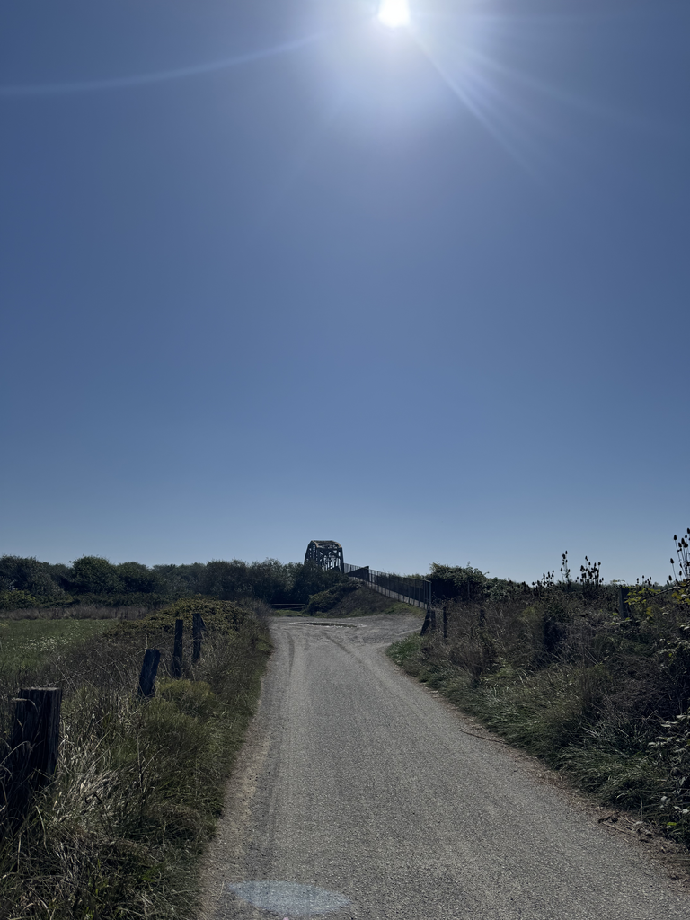 Others were concerned, but not! I've done a lot of sketchy rides! It got tough in the last 10-15 miles to the coast, when we ran into a fierce headwind just as the nasty little hills disappeared. I was riding by myself by this time, and getting a bit tired. Then Zoey, our 22yo wunderkind rips past me cheerily calling hello. I was getting tired, so the idea of drafting someone else was appealing. I tentatively upped my pace to see if I could hold on, though she was already a couple hundred feet ahead. I could! So I used the last of my energy to reel her in and we zipped along chatting happily for five minutes until, w/ an enormous "pfft!", my rear tire went flat.