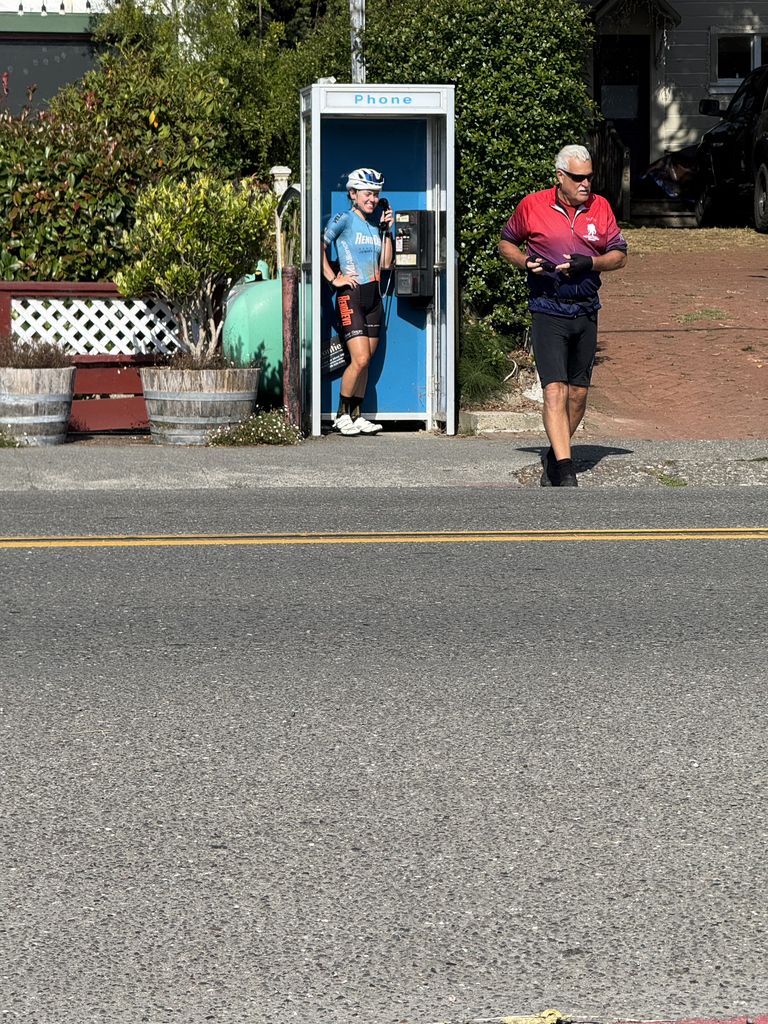 Today was mostly cute small towns, morphing gradually (as we crossed the hills) into coastal landscape, w/ a crazy stretch of a short climb followed by a long fast downhill on the shoulder of 101, which here was a divided, limited access highway whose shoulder was strewn with the debris of exploded truck tires.