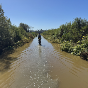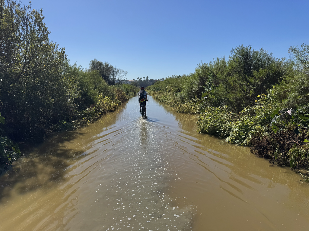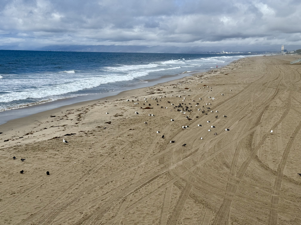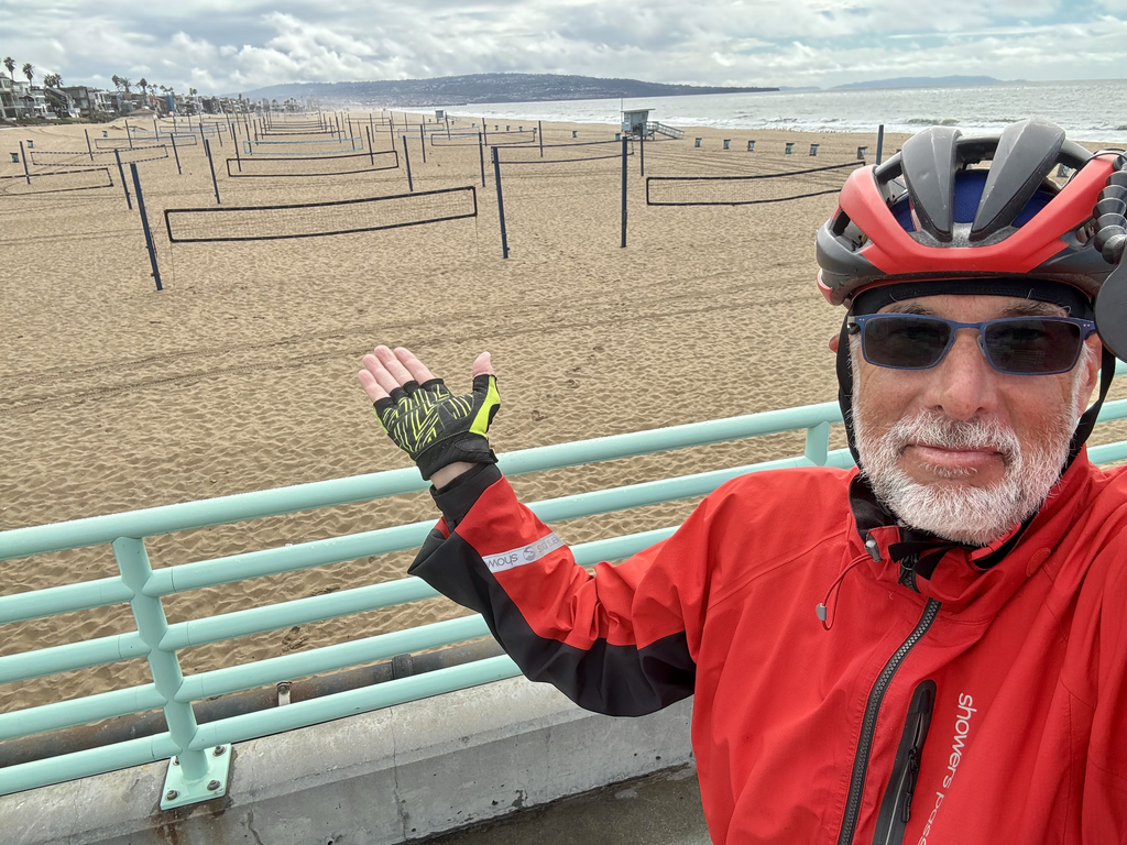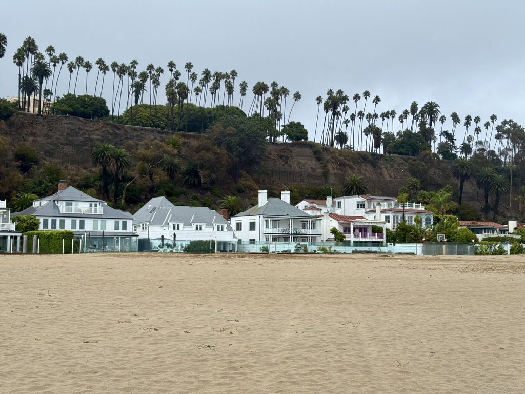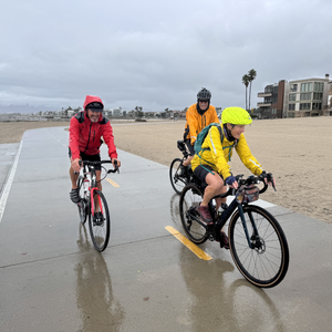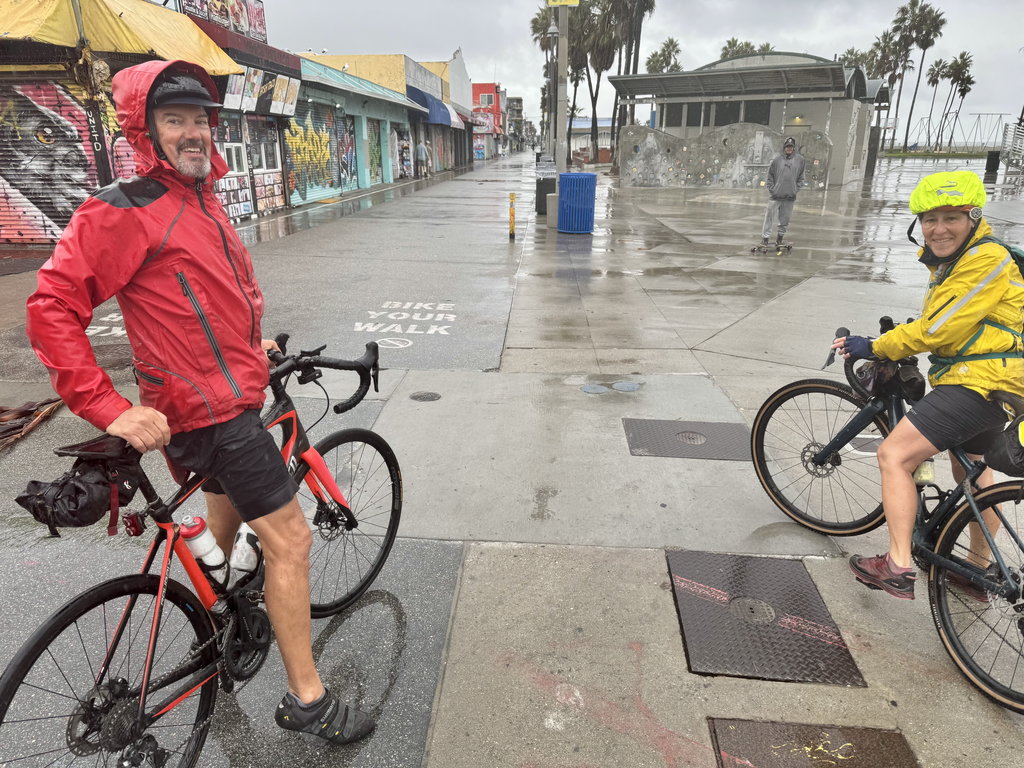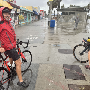 The rain, w/ temp in the 50's, continued for the next 3-4 hours as we rode down a busy road still under construction because of damage from the Palisades fire. There was burned wreckage on the water side; up the hill lots of lots had been razed down to foundations.