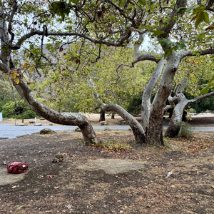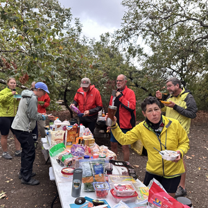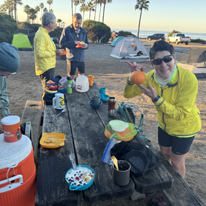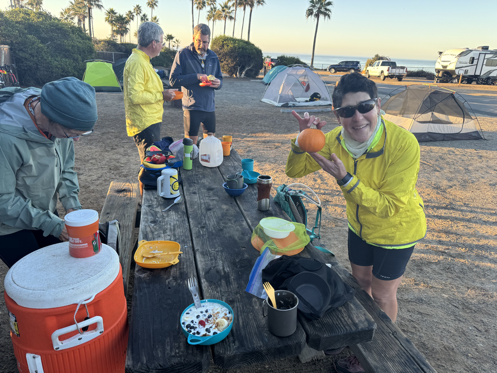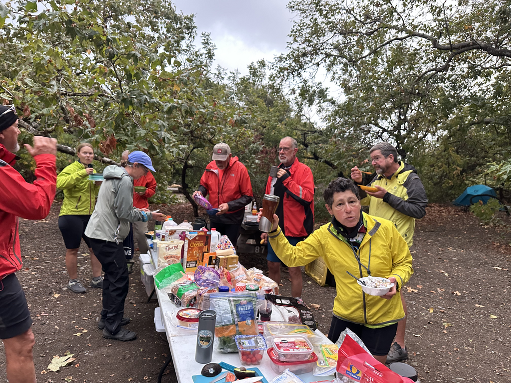 We have a rotating pair of cooks for each day. Ideally, the cooks and the van driver leave the campground at 3pm to go shopping for the dinner, and for breakfast and lunch supplies. In this crowd, the leaders have included themselves in the rota, though this is a bit unusual, and very welcome. W/ a total of 14 people, this means everyone is cook for one day per week, six total in this trip. Hardly honorous, though a bit stressful for those who don't often cook (me). Appetisers (usually chips and veggies) are put out at 5, dinner served at 6, and map meeting (where we discuss the coming day's ride) is at 7. Obviously this sometimes needs to be adjusted for longer or more difficult days (71 miles and 4030 ft of climbing tomorrow), but since we aren't carrying our own gear we can usually get to the site quickly when necessary. And the site is almost always a campground. On the west coast, and especially in NoCal, this usually means beautiful sites, ocean views, maybe a redwood or 100.