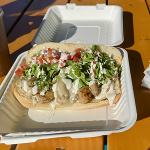 So I started late, but still earlier than our speedsters: Zoey and Bob Hake, who can sprinting around me on an 8% hill. That was impressive. Eventually I made it to the top, and we had miles of fun rollers: hills even enough that if you sprint downhill you have a good chance of creating the next hill still moving along. In this way I caught Jeff G, chatted for a bit, and then caught Doug and Molly. I rode with them for several miles before catching Pam, and we traveled off and on again for the rest of the day. With Stephon we stopped at The Bait and Tackle for espresso (I also had a shrimp po-boy for second breakfast).